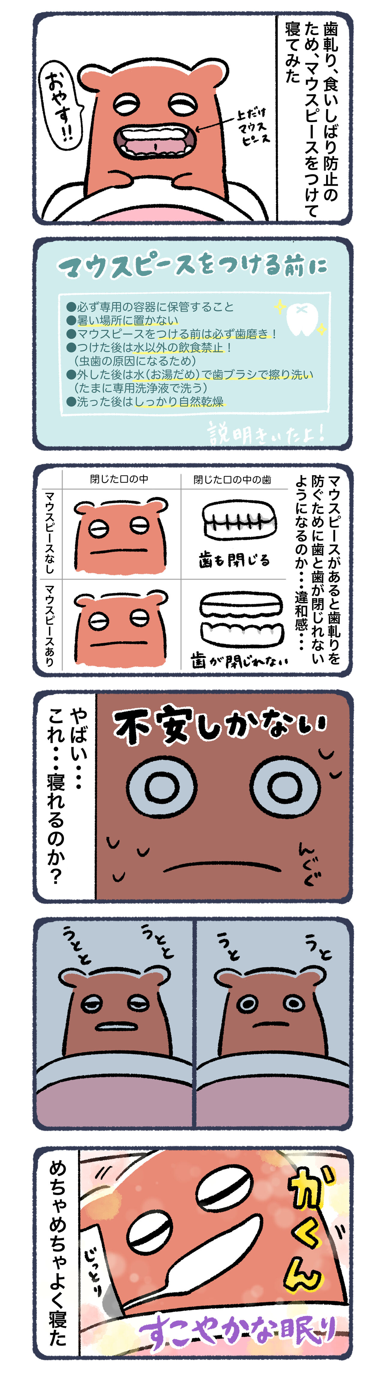 2022年04月24日 マウスピースをつけて寝てみた! ぐっすり寝れました笑気になる方もいらっしゃるようなので個人差はあるようです。▲上の歯につけるマウスピースです。シリコン製で熱に弱いので、お湯やストーブなど熱いものには当てないようにとのことでした。金額はマウスピース代と歯茎の診察が入っていたので3600円程でした。そんなに高くなくて安心しました!これから夜寝る前につけて予防をしていきたいと思います!今回マウスピースを作ってもらって思い出したのですが、そういえば学校や会社であくびをしないように食いしばっていたなぁ〜と思い出しました💦かなり顎に負担がかかるらしいので気をつけよう・・・歯軋りや食いしばりに悩みがある方は、歯医者さんに相談してみてはどうでしょうか?▼前回のマウスピースのお話はこちら ▼LINEで更新通知が受け取れます!ランキングに参加しています!▼よかったらポチッてしてね!にほんブログ村