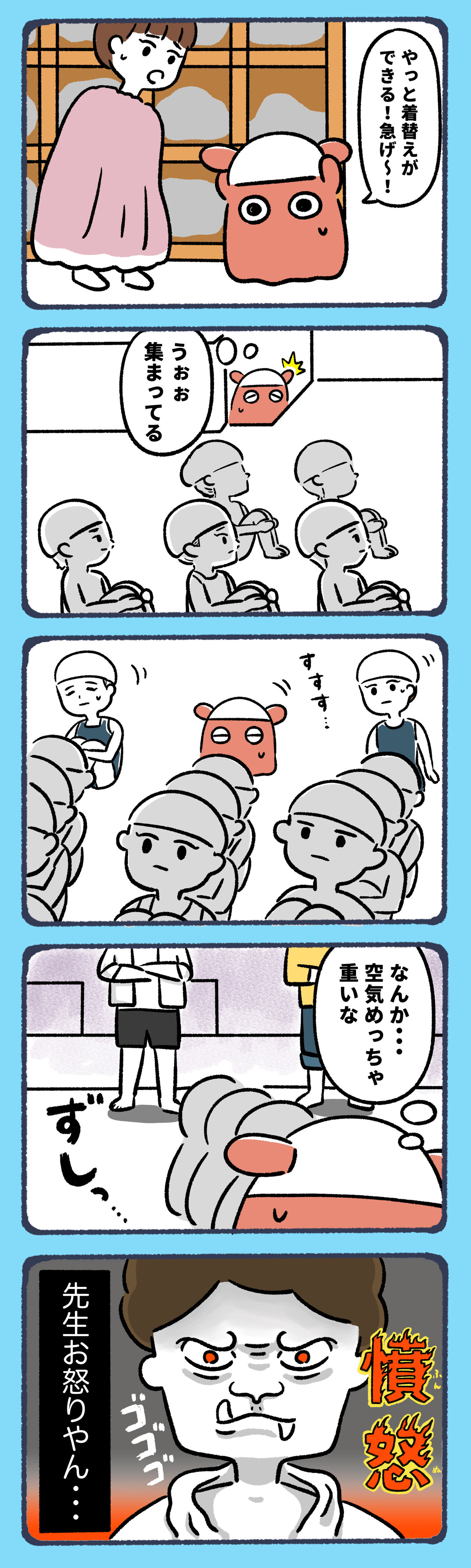 2023年03月26日 おしりをやけどした話5 更衣室が狭いので、1クラスでちょうどよかったのですが3クラス合同授業だったのでもう入れなかった・・・仕方なく空くまで待つしかなく、友達と順番待ちをしていました。男子は着替えは早いのですが、更衣室で遊んでいたのか叫び声が途絶えませんでした笑そんなドタバタがあり、水着に着替えてプールサイドに行くと・・・⑥▼ ④▼ ▼LINEで更新通知が受け取れます!ランキングに参加しています!▼よかったらポチッてしてね!にほんブログ村#コミックエッセイ