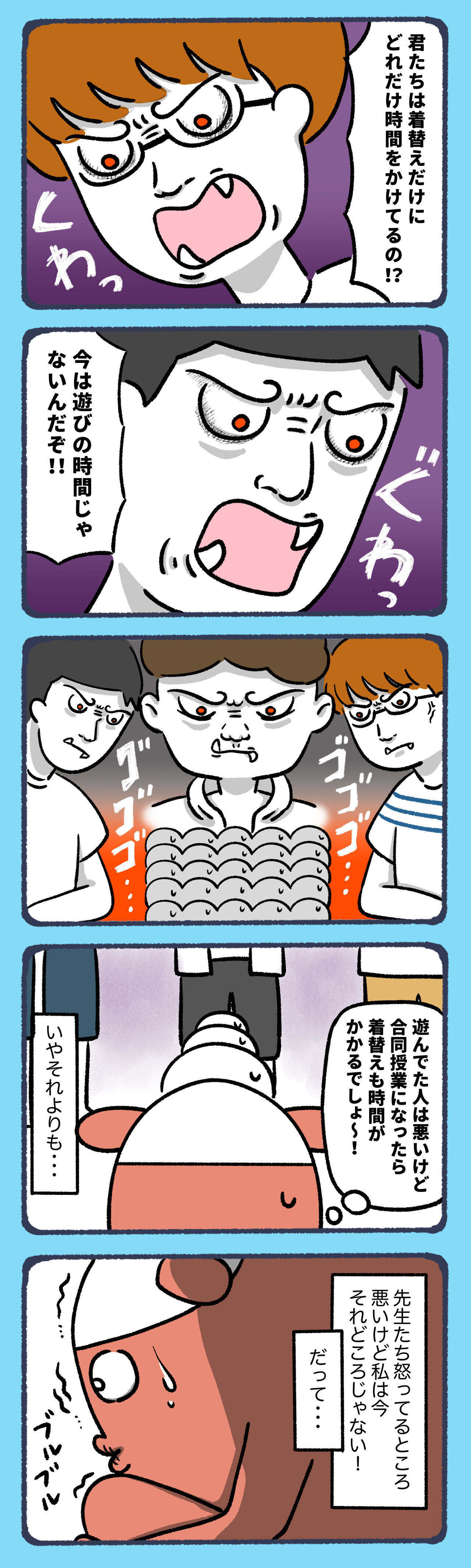2023年03月29日 おしりをやけどした話8 お怒り三人衆がやってきた!!そ〜〜んなこと言われたってしょーがないでそ!!!更衣室狭くて人数多いんだから!と思いつつ、直接言う勇気はなく・・・いやいやでもそんなことより、こっちは大変なんだよ・・・今日の授業はとっても日差しが強かった。そのせいで・・・⑨▼ ⑦▼ ▼LINEで更新通知が受け取れます!ランキングに参加しています!▼よかったらポチッてしてね!にほんブログ村#コミックエッセイ