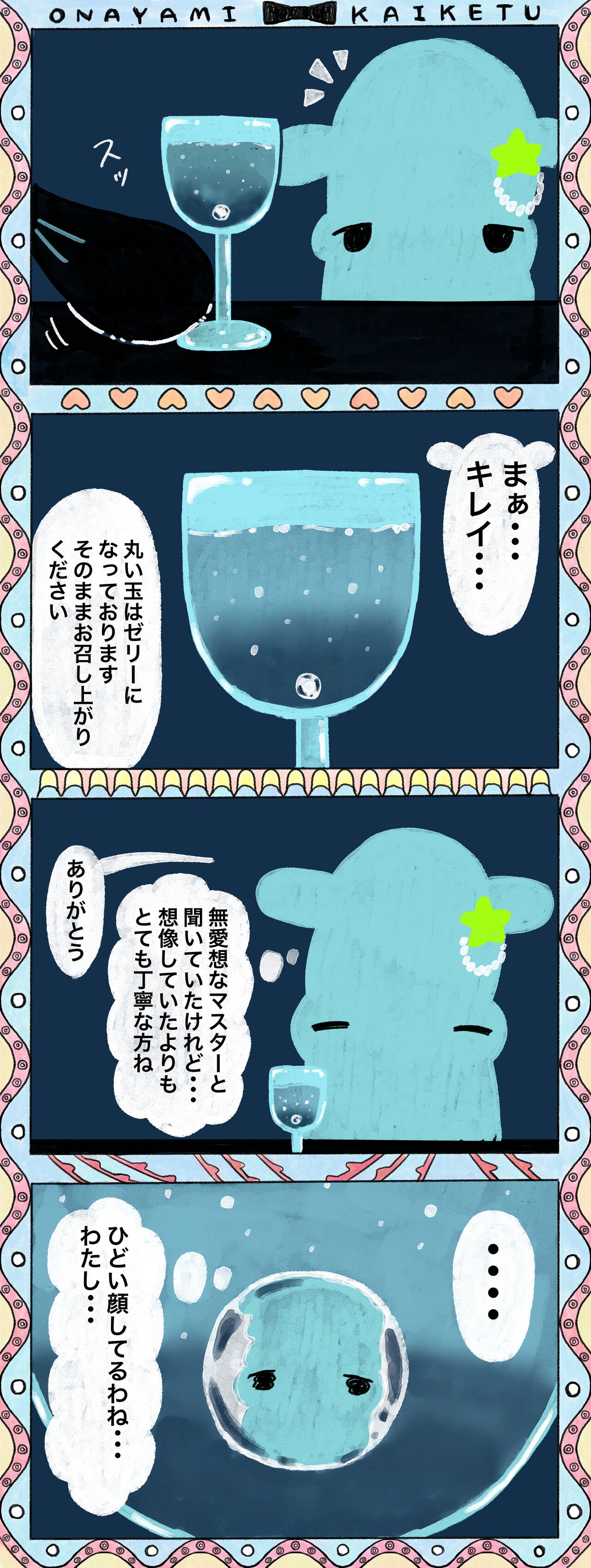 2023年06月28日 【創作漫画】お悩み解決バー② 【あらすじ】深海のある場所に、新しくバーができた。そのバーにはちょっと無愛想なマスターがいるのだがなんでも、悩みを解決してくれるという噂があった・・・。 ③▼ ①▼ ▼LINEで更新通知が受け取れます!ランキングに参加しています!▼よかったらポチッてしてね!にほんブログ村#コミックエッセイ