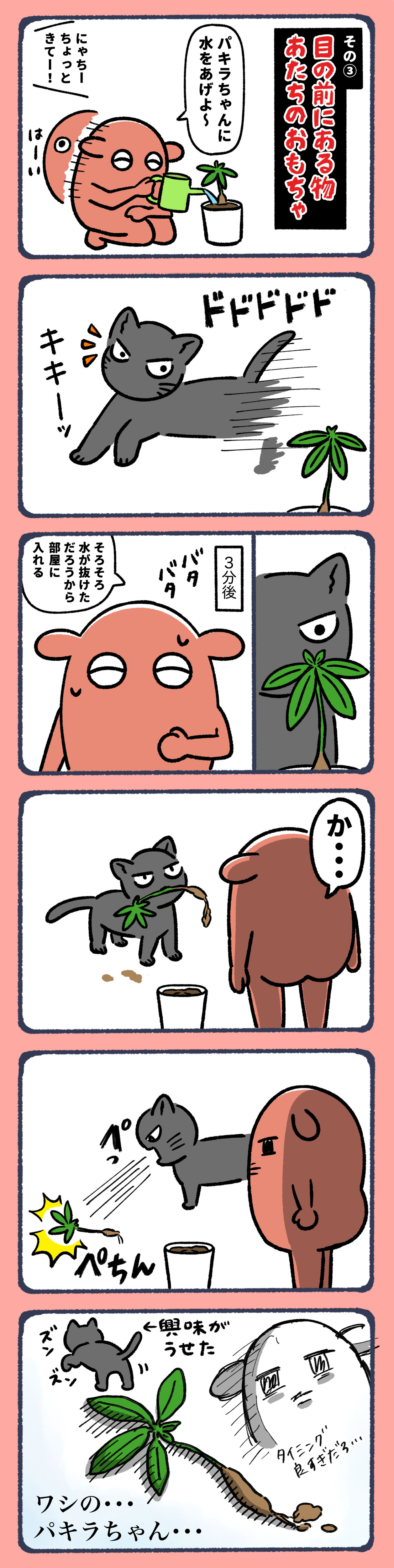 2023年06月21日 まめの所業⑥ 普段植物は家の中に入れて猫たちに触られないようにしていますが、(猫に合わない植物もあるため)水やりをするときは外で水をあげて鉢底の穴から水が出なくなってから(鉢底の穴から水が出るまでたっぷりあげた後)家の中に植物を入れます。いつもはずっと外で様子を見ているのですが、今回はたまたま数分目を離したらまめがパキラを引っこ抜いていました😭あたちの目に入る物全ておもちゃと化すの困るわ〜〜〜⑦▼ ⑤▼ ▼LINEで更新通知が受け取れます!ランキングに参加しています!▼よかったらポチッてしてね!にほんブログ村にほんブログ村#コミックエッセイ