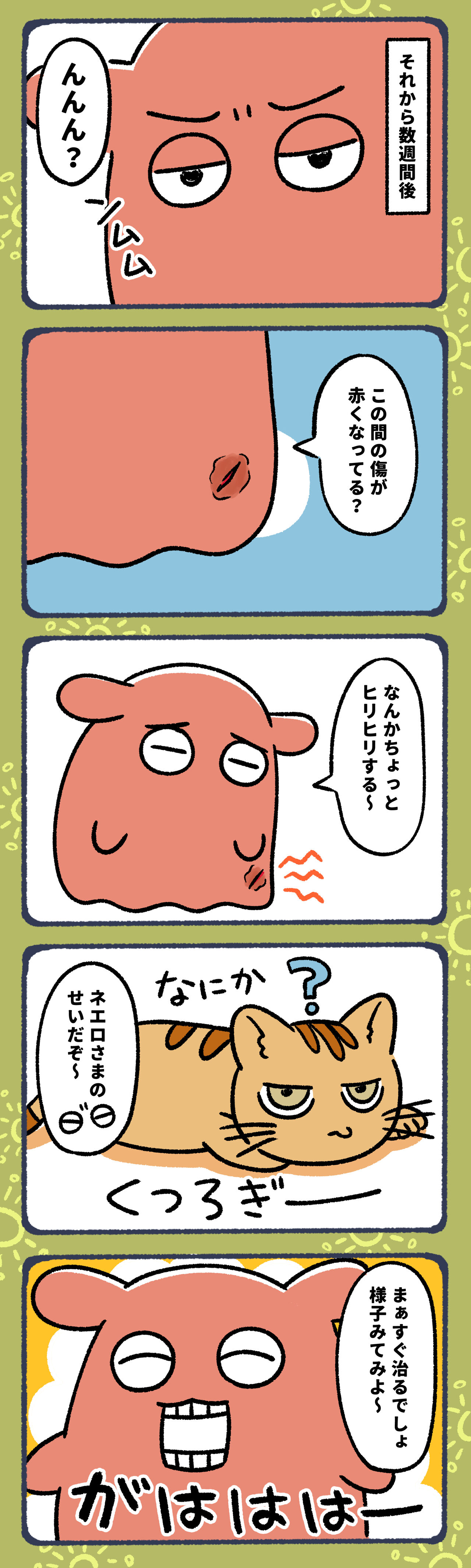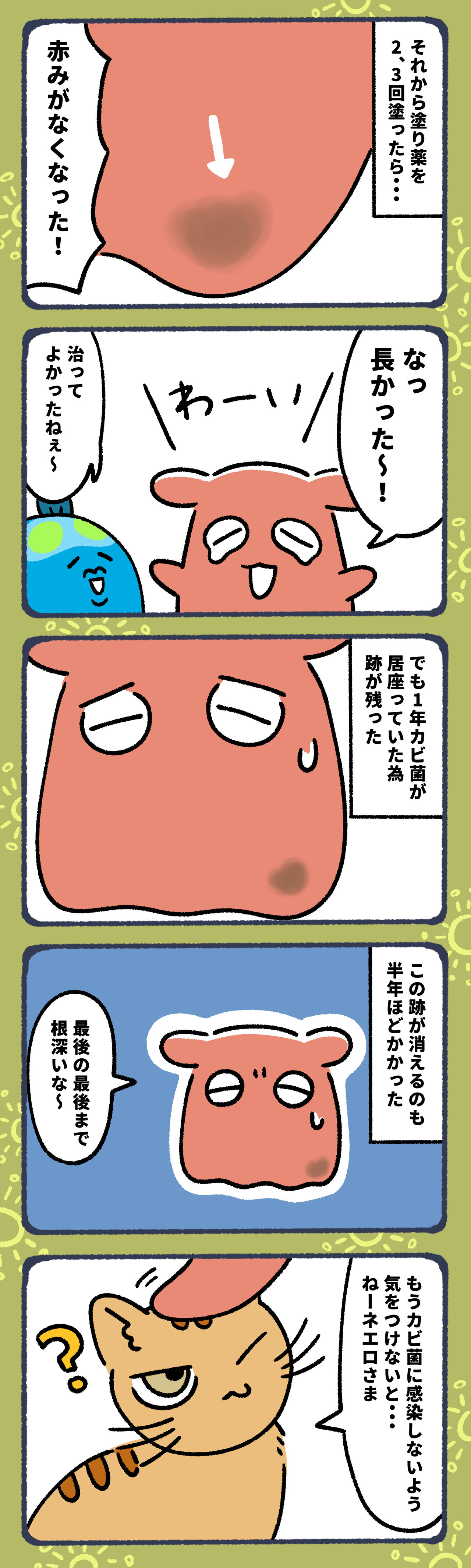 2023年02月17日 大好きなネコにカビ菌もらった話12【終】 ここまで見ていただきありがとうございました!ネエロさまが傷のあるお膝に乗っただけで、ここまで酷くなるとは思わなかったカビ菌騒動。インスタのコメントでは、同じように動物から感染した方がいらっしゃいました。そして完治まで時間がかかったそうです。皆様もお気をつけくださいね。カビ菌を侮るなかれ。明日からは新しい連載を始めますので見にきてね〜!今日はお休みしましたが、明日は朝の更新もありますのでそちらもどうぞよろしくお願いします!次のお話はこちら▼ 前回のお話はこちら▼ ▼LINEで更新通知が受け取れます!ランキングに参加しています!にほんブログ村#コミックエッセイ▼よかったらポチッてしてね!