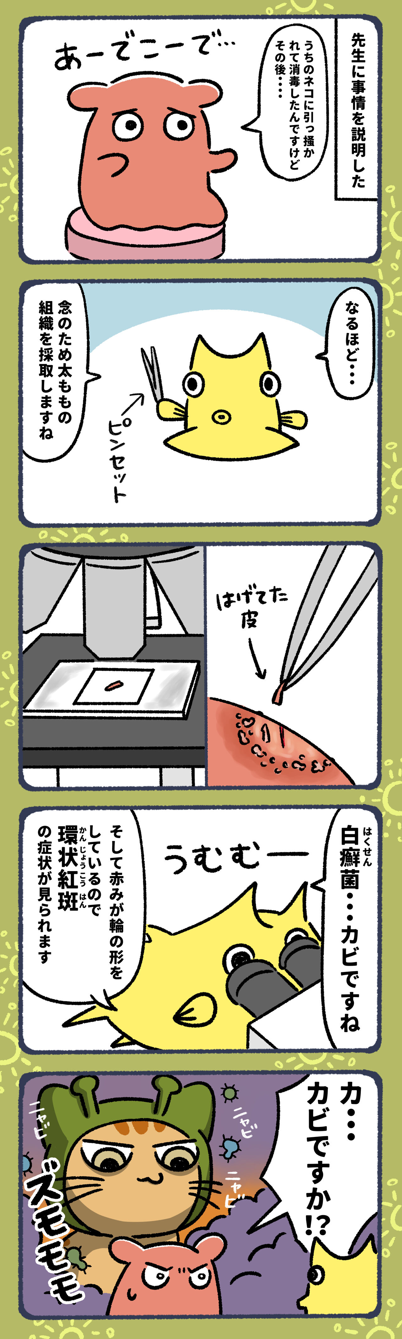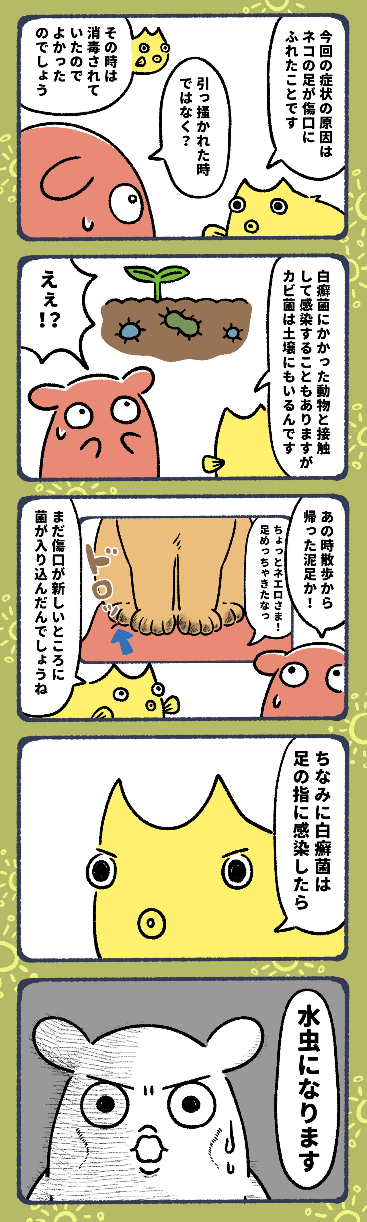 2023年02月13日 大好きなネコにカビ菌もらった8 最初の引っ掻き傷から菌が入り込んだと思っていましたが、泥足で膝に乗られた時に菌に入ったのか・・・。そして土壌にもカビ菌がいると言われてびっくりしましたが、園芸用の土がたまにカビが生えてることがあったので(袋の中で湿って長期保管していると生える)なるほど納得・・・という感じでした。それよりも白癬菌(はくせんきん)って水虫の元なのね!!そっちの方が衝撃でした!⑨▼ 前回のお話はこちら▼ 今朝更新したお話はこちら▼ ▼LINEで更新通知が受け取れます!ランキングに参加しています!▼よかったらポチッてしてね!にほんブログ村#コミックエッセイ