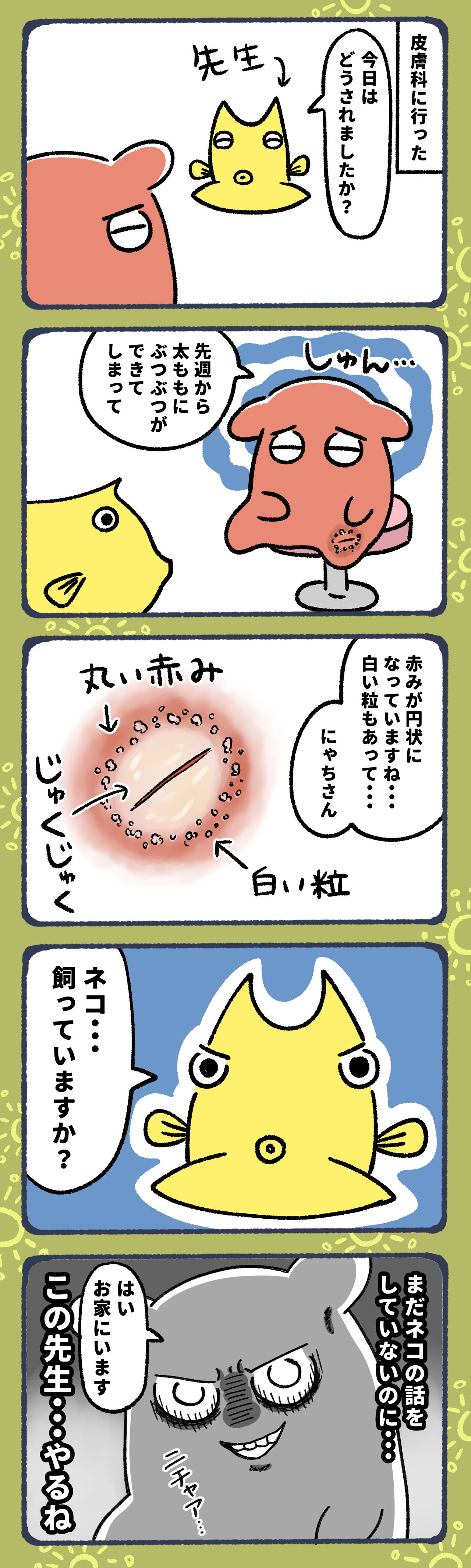 2023年02月11日 大好きなネコにカビ菌もらった6 こんな邪悪な顔やっとる場合ではない笑というか一日経っただけで傷が酷くなりました😂先生にはまだ猫の話をしていなかったのですが、皮膚の状態を見てすぐに「お家に猫いますか?」と聞かれました。すげぇ・・・!!なんでわかるんだ!!と少し興奮しました笑⑦▼ 前回のお話はこちら▼ 今朝更新したお話▼ ▼LINEで更新通知が受け取れます!ランキングに参加しています!▼よかったらポチッてしてね!にほんブログ村#コミックエッセイ