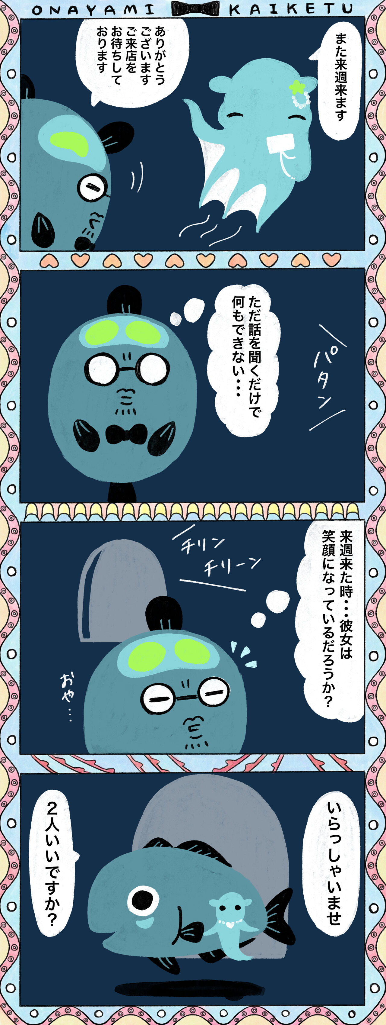 2023年07月09日 【創作漫画】お悩み解決バー10 〰︎〰︎〰︎〰︎〰︎〰︎〰︎〰︎〰︎〰︎〰︎〰︎〰︎〰︎〰︎〰︎〰︎〰︎〰︎そういえば海の中の話を描いていますが海は小さい時に行ったきりです。サメ怖いもの笑サメの真っ黒な目が苦手です。いないのはわかっているけど怖い😱水着もないしな!!がははは!11▼ ⑨▼ ▼LINEで更新通知が受け取れます!